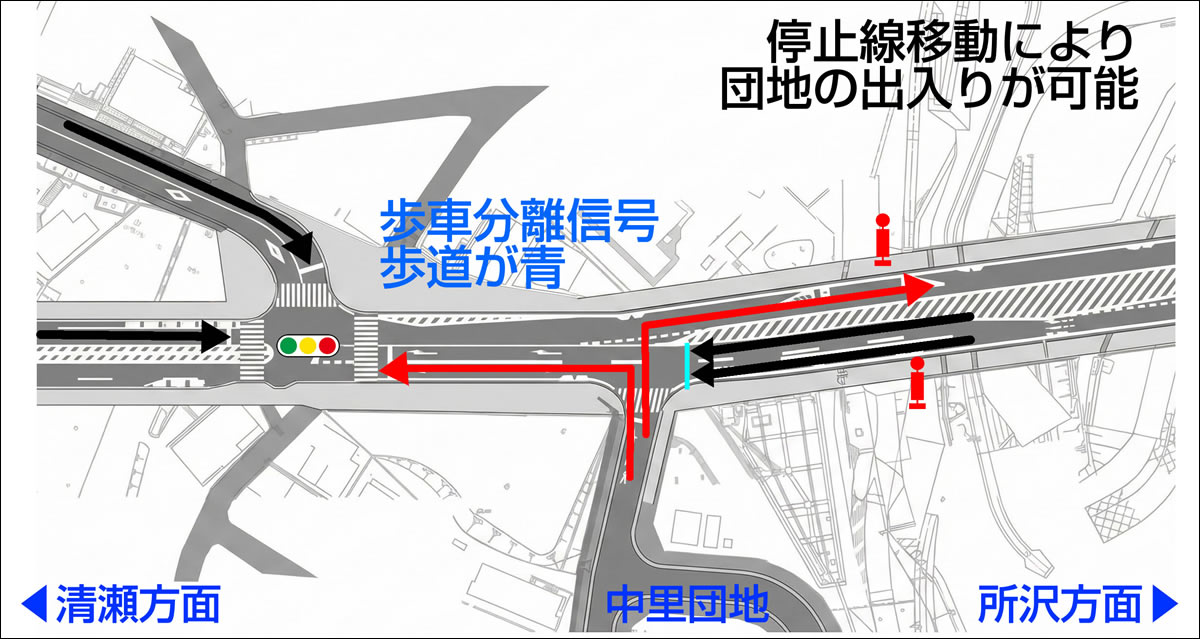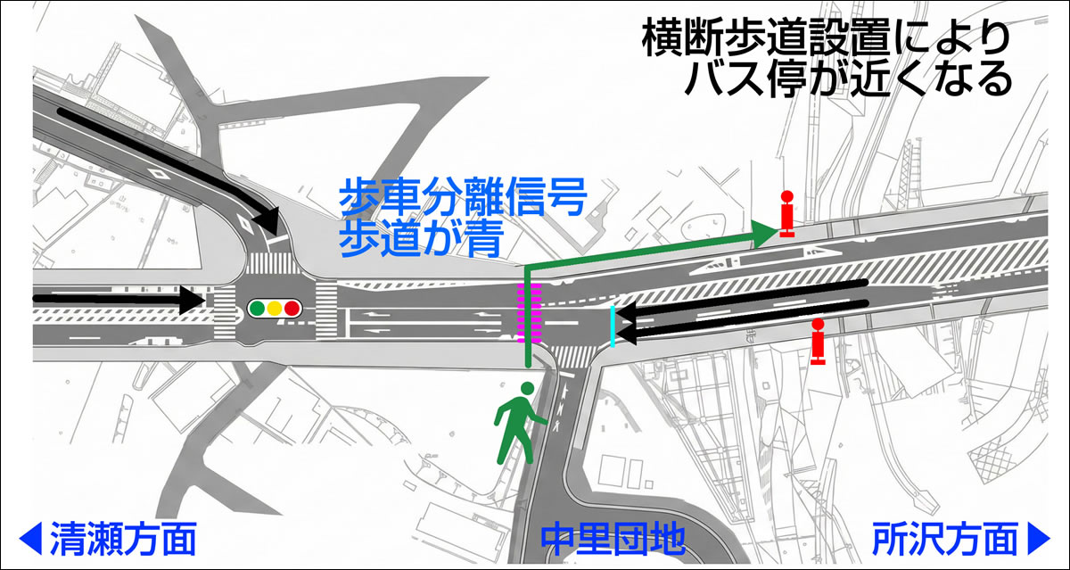 ¤Þ¤¿¡¢¥Ð¥¹Ääα½ê¤Ø¤ÎưÀþµÚ¤Ó²£ÃÇÊâÆ»¤ÎÀßÃÖ°ÌÃ֤ˤĤ¤¤Æ¤âÊѹ¹¤¬Í½Äꤵ¤ì¤Æ¤ª¤ê¡¢½¾Íè¤Î¥Ð¥¹Ää°ÌÃÖ¤è¤êË̦¡¢¤Ä¤Þ¤ê½êÂôÊý¸þ¤ØÌó60¥á¡¼¥È¥ë°Üư¤¹¤ë·Á¤È¤Ê¤ê¤Þ¤¹¡£¤³¤ÎÊѹ¹¤Ëȼ¤¤¡¢ÃæÎ¤ÃÄÃϤ«¤é½êÂôÊýÌ̥Х¹Ä䤨¤Î¥¢¥¯¥»¥¹¤Ë¤Ï¡¢ÅÔ»Ô·×²èÆ»Ï©¤È¾®¶â°æ³¹Æ»¤Î¿·¤·¤¤¸òº¹ÅÀ¤ò²£ÃǤ·¤Ê¤±¤ì¤Ð¤Ê¤é¤º¡¢¸½ºß¤è¤ê¤â±ó²ó¤ê¤Ë¤Ê¤ë¾õ¶·¤È¤Ê¤ê¤Þ¤¹¡£
