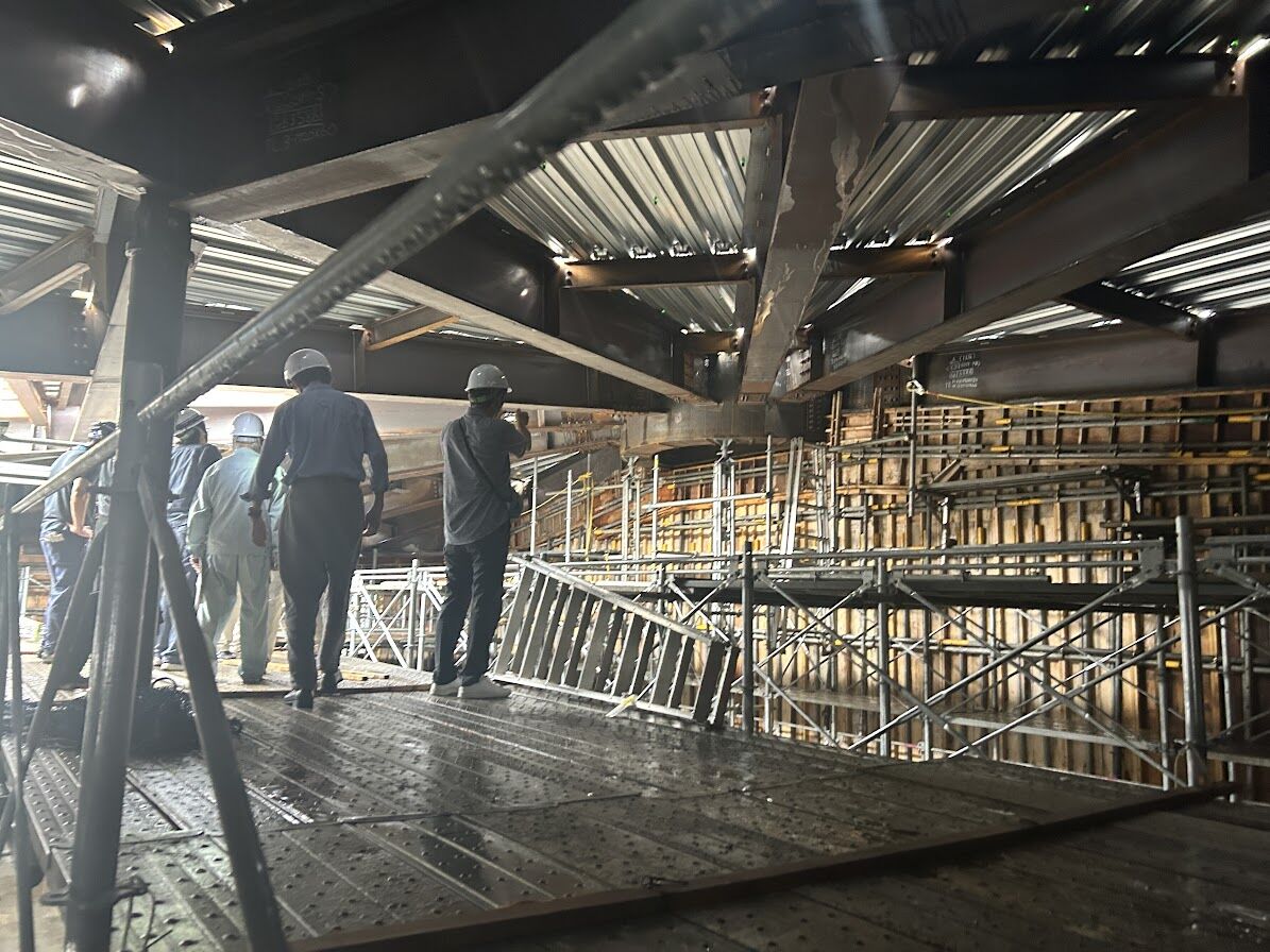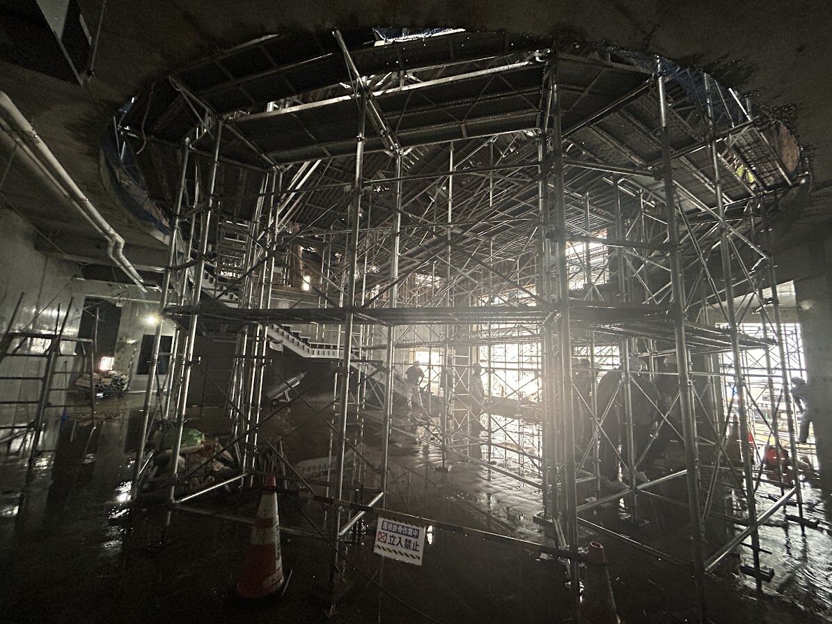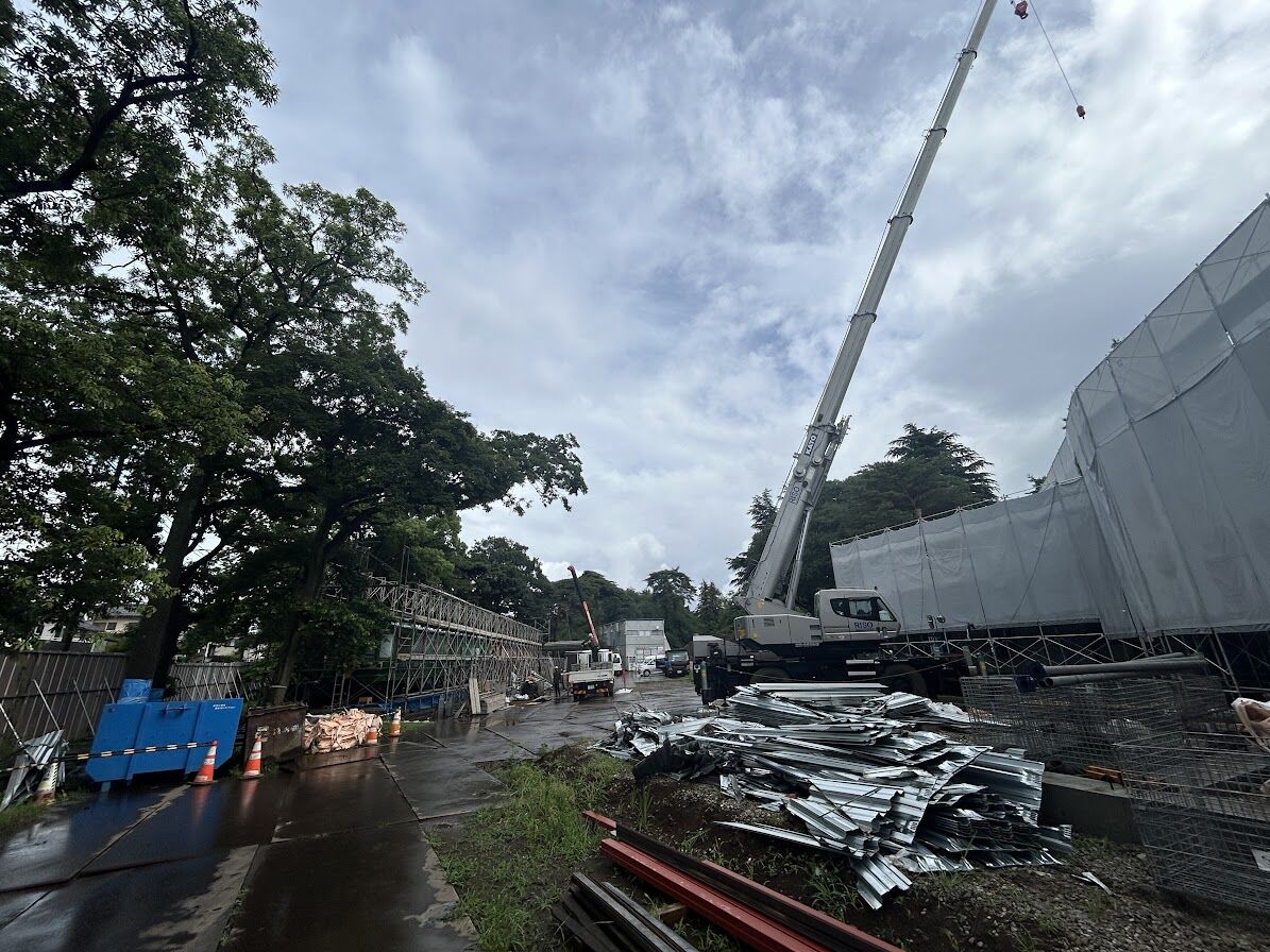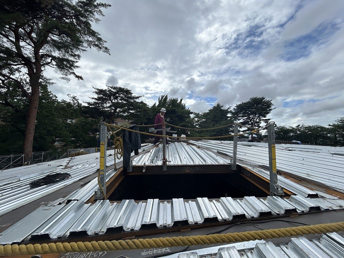 上の3枚の写真は、複合施設の建設の様子です。あいにくの雨だったため、外からの良い写真はとれませんでしたが、内部の屋根の様子がよく分かります。