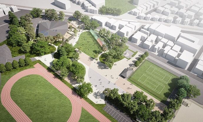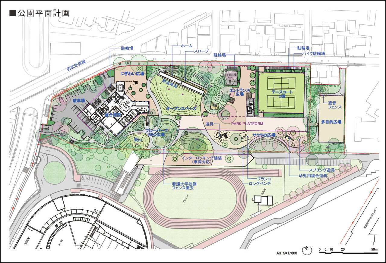 工事は二期計画で進められており、現在、複合施設含む中央公園の西半分エリアで行われています。上は完成パースと設計図面です。