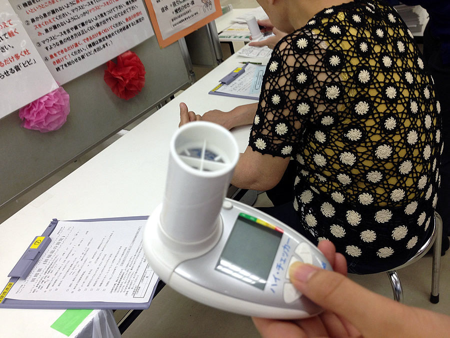 この小さな機械に、息を吹きかけて肺の機能を測るのです。まずは、この機械をくわえて鼻をつつまみ、これ以上は吸えないほど息を吸った後、一気に吹き込みます。