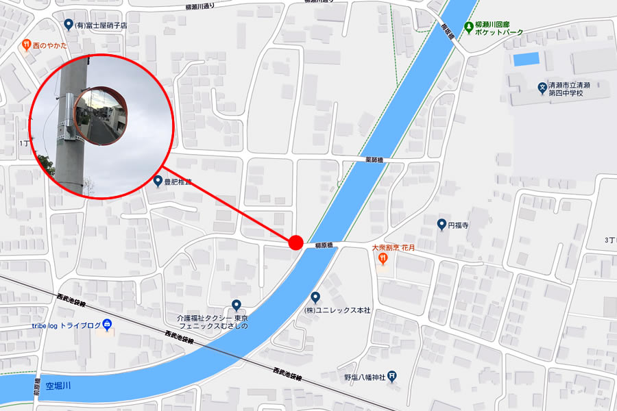 柳原橋側の左は見えますが、右側は家があり確かに見えにくいです。ふつうは突き当たった正面に電柱でもあれば、そこに付けられます。または、自立タイプのカーブミラーの設置ですね。しかし、自立タイプは、付近のお宅の了解を頂いたり、また少々予算が張りますので、時間を頂かなくてはなりません。