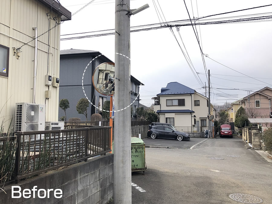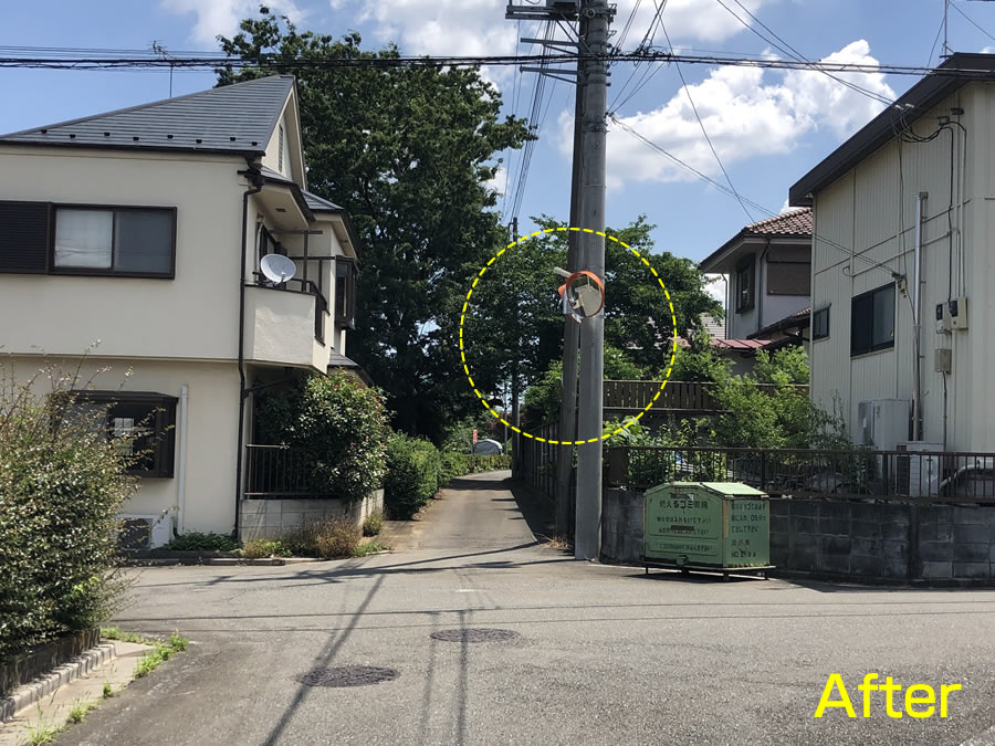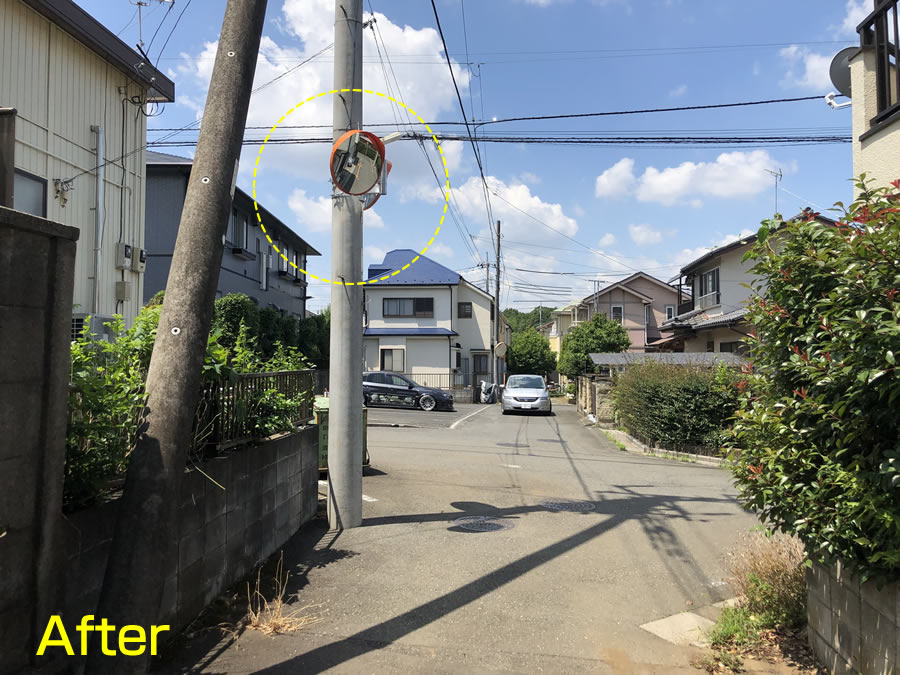 担当課にご相談し、現地にて様々に調査検討して頂き、3カ月後も電柱に新規のカーブミラーを設置して頂きました。