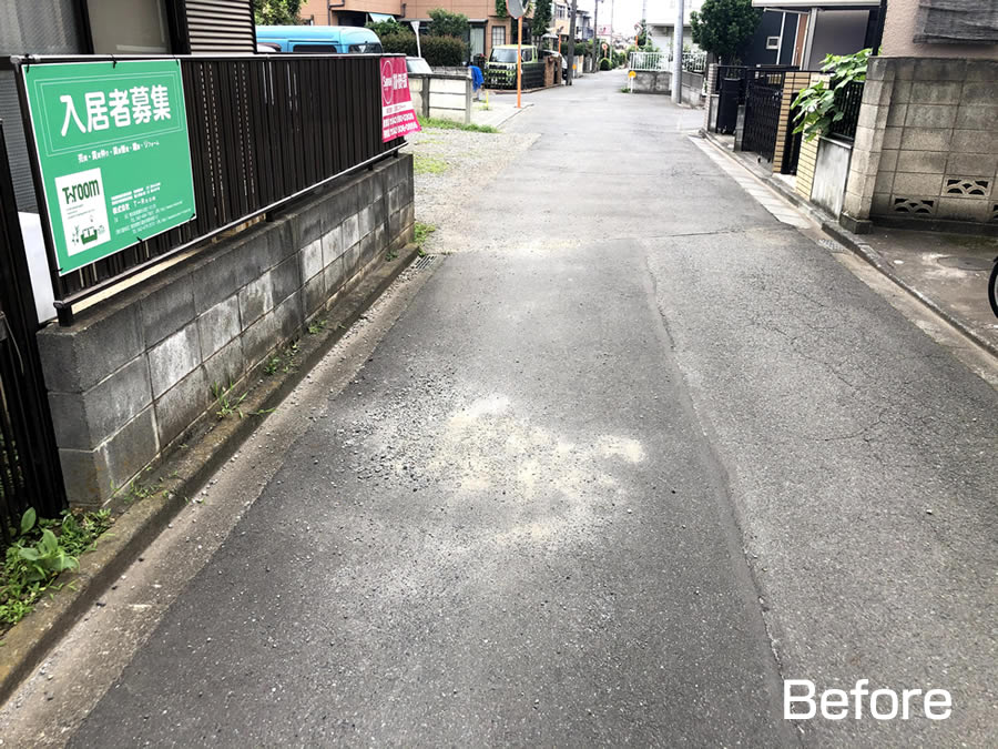 上の2枚の写真を見比べて頂きたいのですが、左右のお宅の塀の仕切りで下の写真と見比べてください。上の8年前の写真では、左のお宅の白い部分とコンクリートの黒い境が見えていました。今回の下の写真では、それを上回っています。右の塀も、塀の水平線が2本見えるのに、今回は1本しか見えません。