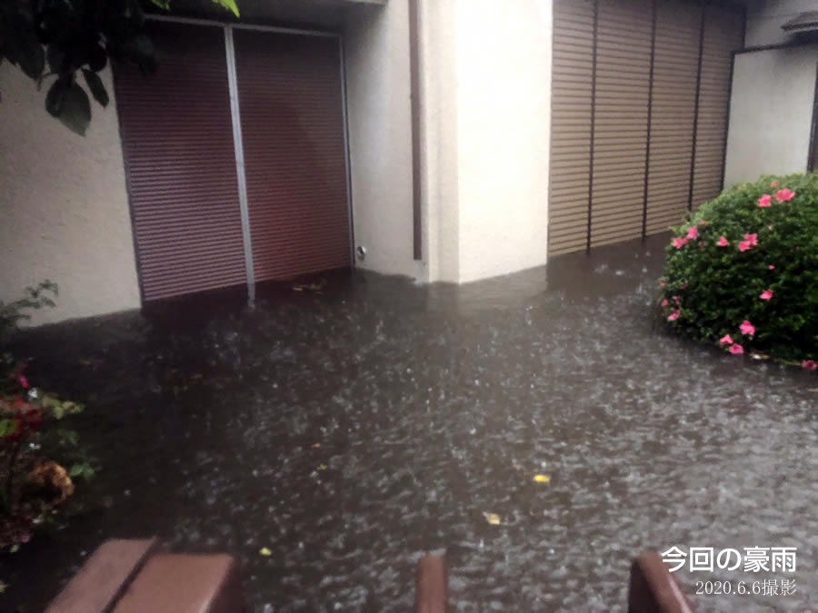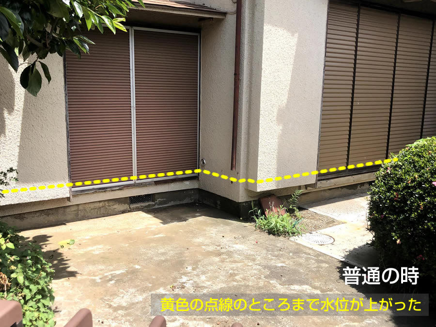 この写真は、そのお隣の玄関口の植栽のあるお宅です。庭部分を見た写真ですが、庭が完全に冠水しています。下の写真が普段のときです。完全に床上浸水してますね。大変な状態です。