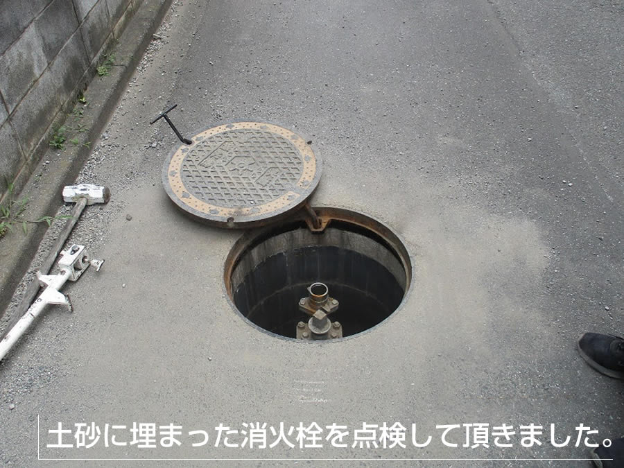 ご相談頂いた方も、土砂はこちらで掃除できるが、もし土砂が中に入ってしまって、いざというときに消火栓が使えないと困るとのことでご相談頂いていました。幸い中は大丈夫でしたが、開けにくいという状態でしたので、ご相談者の不安はあたっていました。