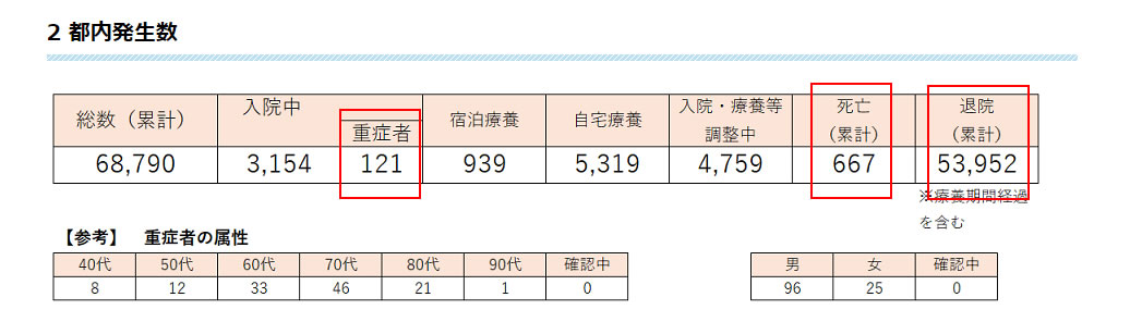 ¤³¤ì¤Þ¤Ç¤Î¡ÖÎß·×Áí¿ô¡×68,790¿Í¡£¤½¤Î¤¦¤Á¡ÖÂౡ¡×53,952¿Í¡£Á´ÂΤÎ78%¤¬¼£Ìþ¤Ç¤¹¡£¡Ö»àË´¡×¤¬667¿Í¤ÇÁ´ÂΤÎ0.9%¡£1%¤Ë¤â¤Ê¤ê¤Þ¤»¤ó¡£¡ÖÆþ±¡Ãæ¡×¤¬3,154¿Í¡£¤¦¤Á¡Ö½Å¾É¼Ô¡×¤Ï121¿Í¡£¤³¤ì¤ÏÎ߷פǤϤʤ¯º£¸½ºß¤Î¿ôÃͤʤó¤À¤È»×¤¤¤Þ¤¹¡£¡Ö½ÉÇñÎÅÍܡפä¡Ö¼«ÂðÎÅÍܡפÏ̵¾É¾õ(̤ȯ¾É)¤È¤¤¤¦¤³¤È¤Ç¤·¤ç¤¦¡£¤½¤·¤Æ¡¢¿Þ²¼¤Î¡Ö¡Ú»²¹Í¡Û½Å¾É¼Ô¤Î°À¡×¤ò¸«¤ë¤È¡¢ÅÔÁ´ÂΤÇ30ºÍ°Ê²¼¤Î½Å¾É¼Ô¤Ï¡Ö0¡×¤Ê¤ó¤Ç¤¹¡£40Âå¤Ç8¿Í¡¢50Âå¤Ç12¿Í¤ÈÂ礷¤¿¿ô¤Ç¤Ï¤¢¤ê¤Þ¤»¤ó¡£¤ä¤Ï¤ê60Âå°Ê¾å¤Ë¤Ê¤ë¤È¿ô¤¬Â¿¤¯¤Ê¤ê¤Þ¤¹¡£