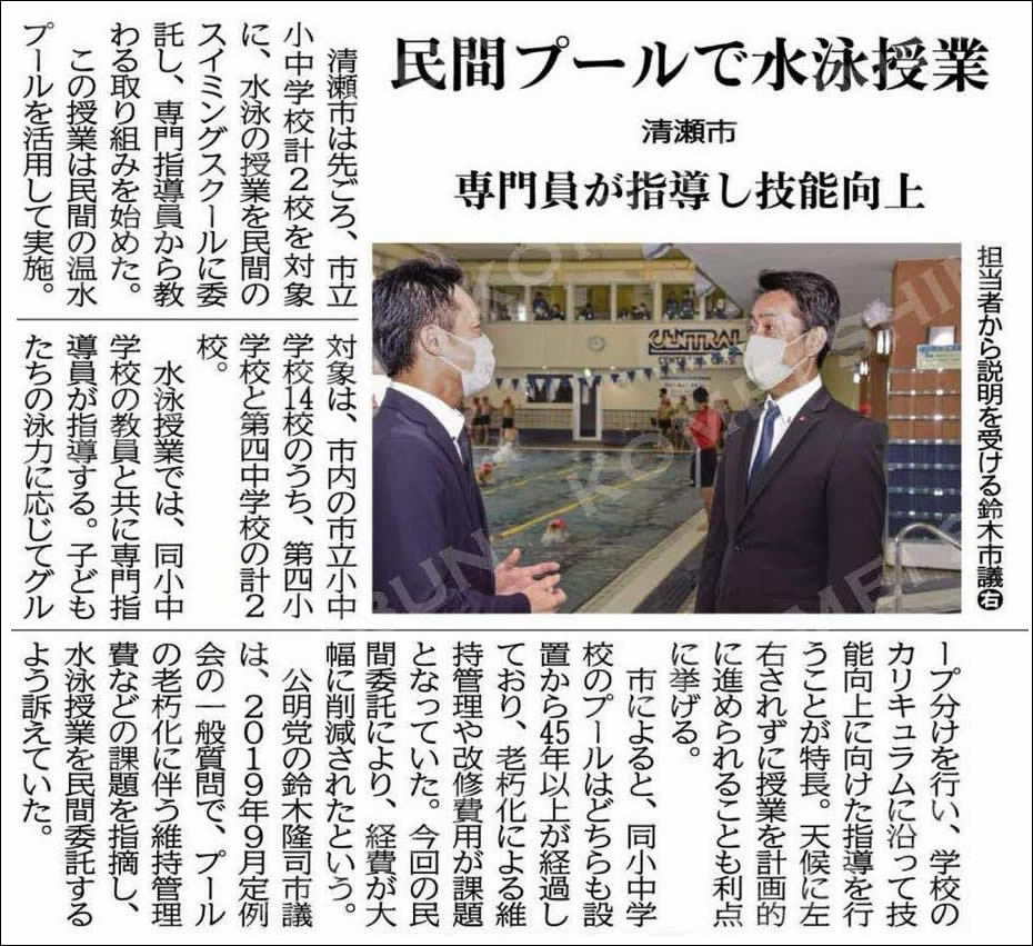 ■「民間プールで水泳授業」、公明新聞に掲載されました。