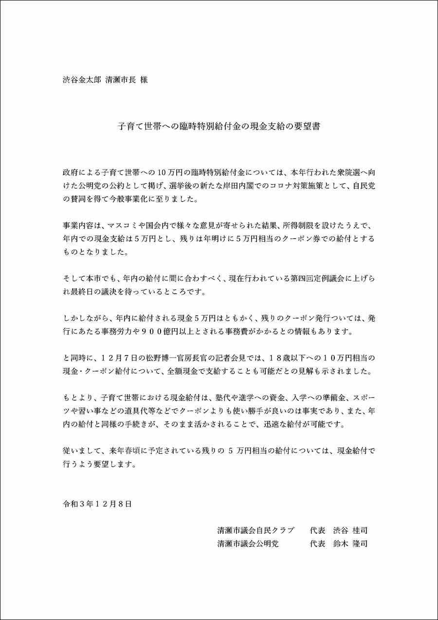 ■現金による一括給付を求める要望書、提出しました。2021年12月14日記事