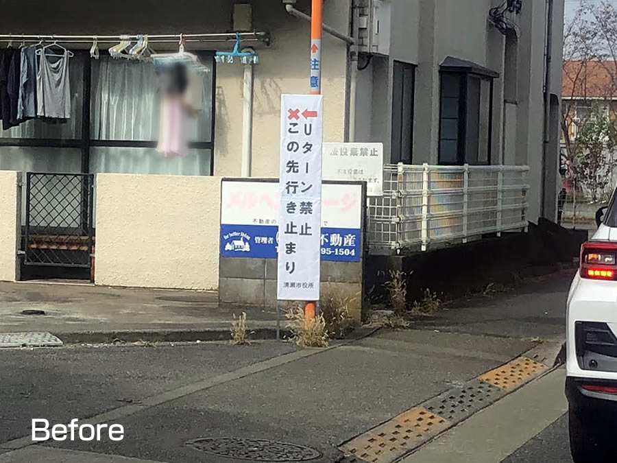 ここは小金井街道の、しかも慢性的に渋滞になる場所のため、どうしても土地を知らない人は抜け道かと入ってきますし、またUターンしようと入ってきます。しかし、小さなお子さんのいる地域ですから、無遠慮に入って来られてUターンされても危ないとご相談を受けていました。