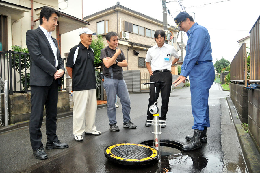 消火栓設置にあたり、清瀬消防の署員の方が説明に来て下さいました。この消火栓はもちろんスタンドパイプも取り付けられますが、消防団や消防署など専門の方が水源として使いますので、これまでのように遠いところからホースを繋げて来る必要はありません。