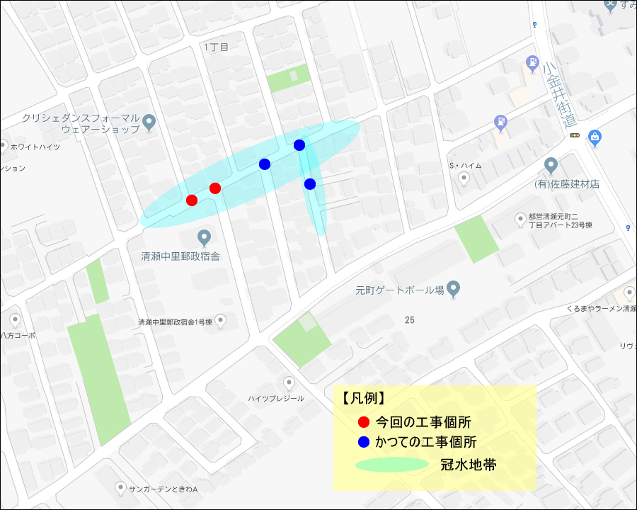 市長はじめ市当局も、重々そのことは理解し承知をしていますが、抜本的な解決法はやはり幹線、ここでは柳瀬川へ雨水を流すための本線としての小金井街道地下の雨水管をかなり太いものにしないと、この地域下の雨水をいくら太くしても流れていきません。