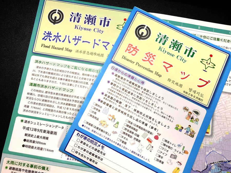 裏は洪水ハザードマップで、豪雨による浸水冠水予測が色を分けて描かれています。「洪水ハザード」はせせらぎのまち・せせらぐ川のまち清瀬にあって、特に重要な情報マップとなります。